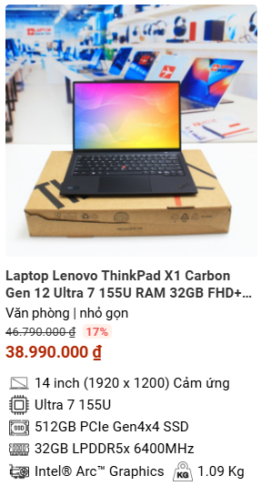 » [TOP 4]Laptop Lenovo ThinkPad X1 Carbon Gen 12 Ultra 7 155U RAM 32GB FHD+ Cảm ứng