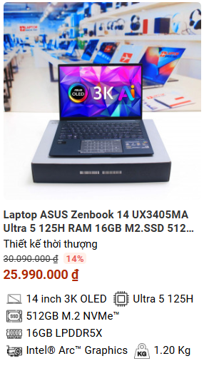• Nếu bạn đang tìm kiếm một chiếc laptop cao cấp doanh nhân  thì ASUS Zenbook 14 UX3405 chắc chắn là một sự lựa chọn hấp dẫn và đáng xem xét. Hơn nữa, với hiệu năng mạnh mẽ của CPU Intel Core Ultra cùng chip AI, ASUS Zenbook 14 UX3405 không chỉ mang lại trải nghiệm hoạt động mượt mà đây còn là sự chuẩn bị cho cuộc cách mạng trí tuệ nhân tạo trên mọi ứng dụng trong tương lai.