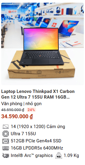 » [TOP 4]Laptop Lenovo Thinkpad X1 Carbon Gen 12 Ultra 7 155U RAM 16GB M2.SSD 512GB FHD+ Cảm ứng