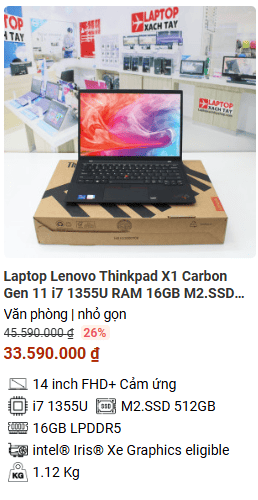 » [TOP 2]Laptop Lenovo Thinkpad X1 Carbon Gen 11 i7 1355U RAM 16GB M2.SSD 512GB FHD+ Cảm ứng
