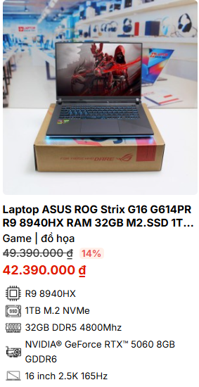 - » [TOP 4]Laptop ASUS ROG Strix G16 G614PR R9 8940HX RAM 32GB M2.SSD 1TB 2.5K 165Hz NVIDIA® GeForce RTX™ 5060 8GB