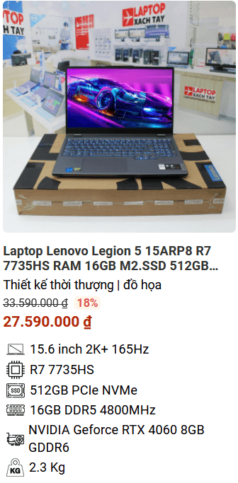 » [TOP 4] Lenovo Legion 5 15ARP8 R7 7735HS RAM 16GB M2.SSD 512GB 165Hz 2K NVIDIA GeForce RTX 4060 8GB