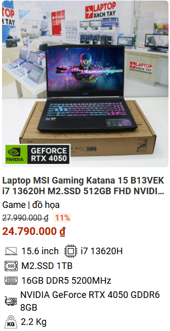 - Phiên bản Dell Gaming G15 5530 đã trở lại với diện mạo hoàn toàn mới, với cấu hình được nâng cấp một cách toàn diện với Intel Core i7-13650HX, 8GB hoặc 16GB RAM DDR5 lắp sẵn, đi cùng với đó là VGA NVIDIA RTX 4050 vô cùng mạnh mẽ.
