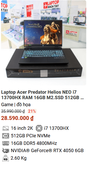 » [TOP 3] Acer Predator Helios NEO i7 13700HX RAM 16GB M2.SSD 512GB 2K 165Hz NVIDIA Geforce RTX 4050 6GB